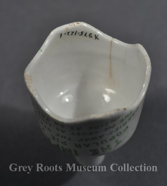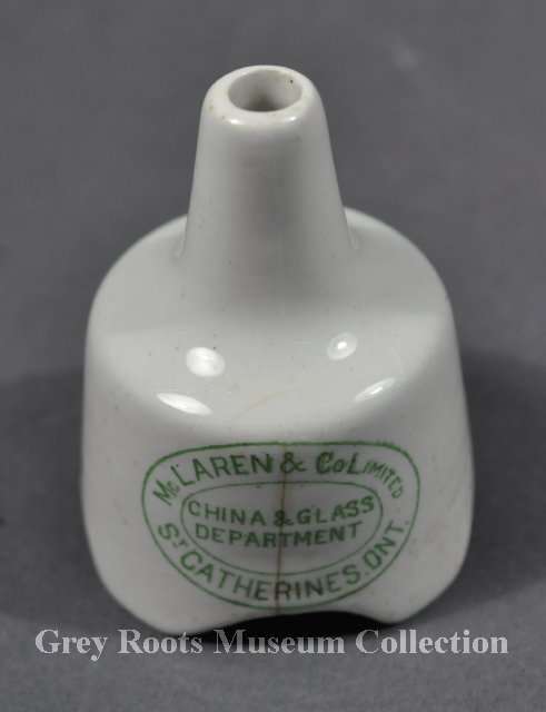 | Description | Pie funnel. Plain white ironstone with smooth glaze. Slight brown stains on glaze. Oval green-coloured transfer-printed design on it stating: "McClaren & Co. Ltd., China and Glass Dept., St. Catherines, Ontario" [The maker mis-spelled the town's name]. |