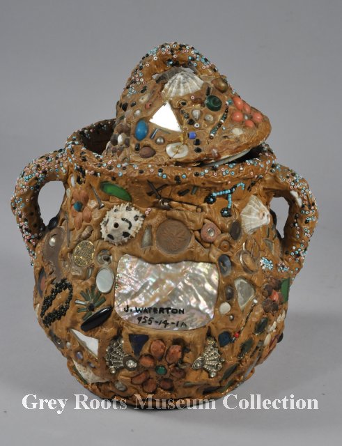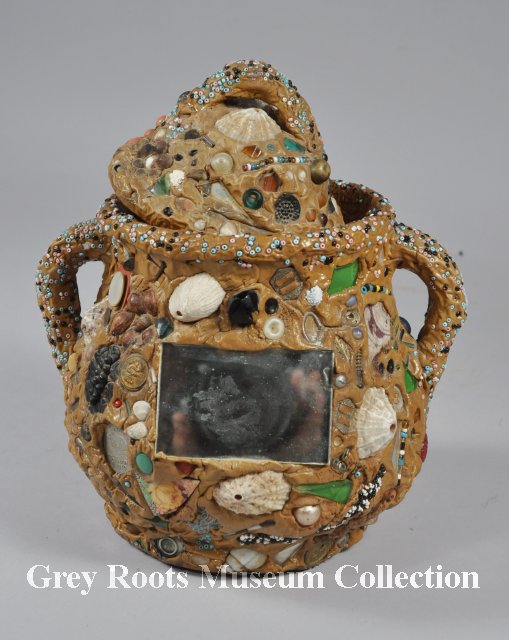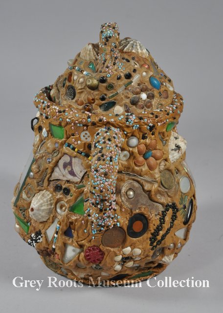| Description | One large sugar bowl with lid. It was covered over with putty work sometime after 1945 (penny date). The putty holds ceramic mosaic and small household items including a key, seashells, beads, a bobby pin, a metal nail, an Osk Kosh metal button, a 1939 nickel, a 1944 penny, and a penny dated 1945. The lid is also altered with putty work and set objects. The base had a green woollen fabric affixed to the underside. It appears that when it was a sugar bowl, it was a white glazed ceramic item (likely ironstone china?) |