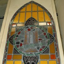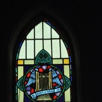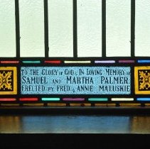 Long, Gothic arched, stained glass leaded window with the central motif of "Hosanna" and a winged heavenly gate. A horizontal dedication at the bottom reads "To the glory of God & in loving memory of Samuel and Martha Palmer. Erected by Fred and Annie Maluskie." The majority of the glass panes are yellow. |